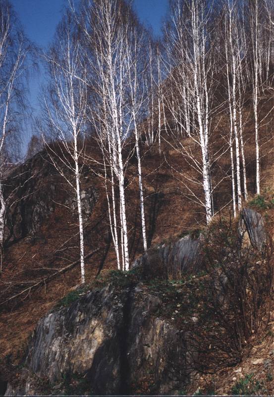 White birches (Betula pendula Roth.; = Betula verrucosa Ehrh.) on limestone rocky clifs on the Ukrop Ribulet left bank in early spring.
