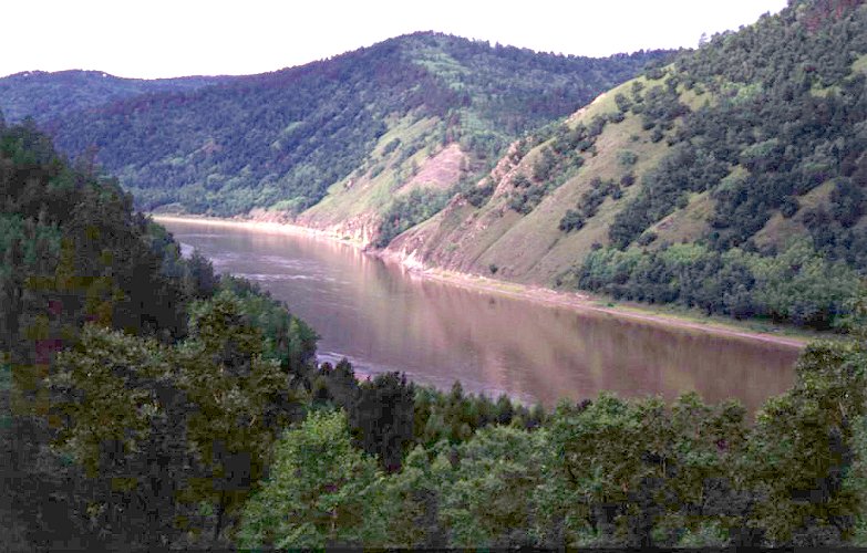 The Argun' (Haliar) River valley at the mouth of the Budyumkan River. The slopes are covered either with meadow steppes or Dahurian birch (Betula davurica Pall.) groves or Dahurian larch (Larix gmelinii (Rupr.) Rupr.) forests. The mountains behind the Argun', the Tsi Ling Shan Mt. Range, are Chinese and represent the northern extreme of the Great Hingan Mts. The Argun' divides Russia and China.
