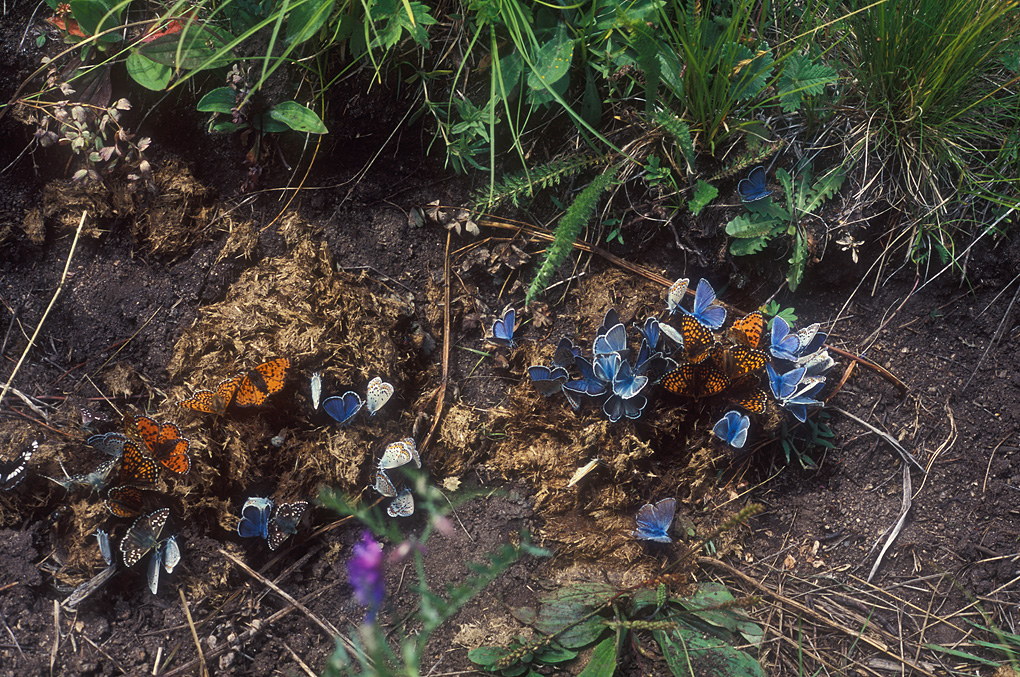 Blues (Lycaenidae, Polyommatinae), fritillaries (Nymphalidae, Meliteinae) and skippers (Pyrgus alveus) on a fresh horse dung.