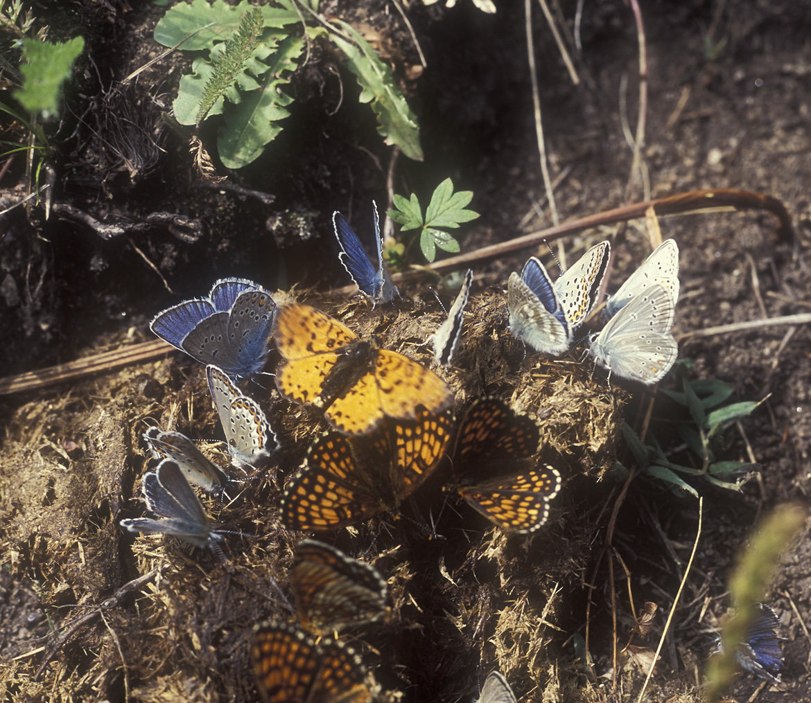Blues (Lycaenidae, Polyommatinae) and fritillaries (Nymphalidae, Meliteinae) on a fresh horse dung.
