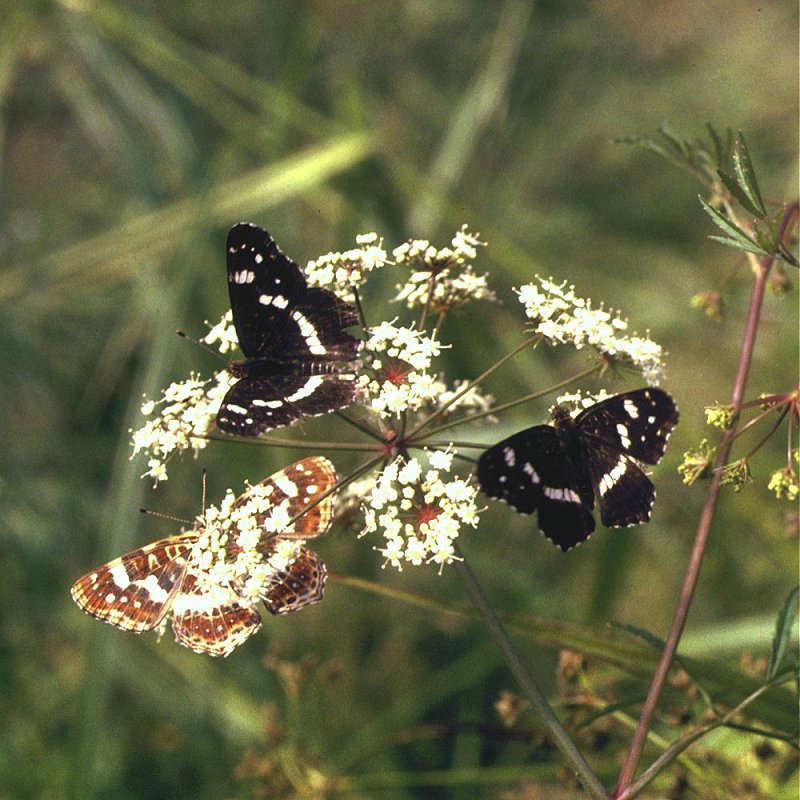 This species is famous for its drastic seasonal variation. Butterflies of a spring brood, forma levana Linnaeus, hatched from over-wintered pupae, are red with a black pattern and few small white spots at the fore wing apex, those of a summer brood, forma prorsa Linnaeus, are black with white bands and spots and fine yellowish reticulation. In some places a third autumn brood, forma porima, Oschenheimer, 1807, develops with intermediate characters. In a northern range and in the mountains only one brood developes, with the characters of forma levana. A very similar species, Araschnia burejana Bremer, 1861, exhibiting the same variation, exists in East Asia sympatrically to A. levana and flying 1-2 weeks later.